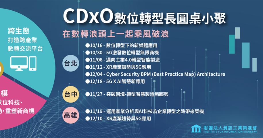 世界經濟論壇(WEF)研究,數位轉型可創造超過100兆美元的價值。WEF認為領導者應聚焦在商業模式創新、生態體系建構、組織文化轉變、數位技能提升與資安隱私等五大關鍵議題著力。資策會希冀以「數位轉型的化育者( Digital Transformation Enabler)」為定位並與產業/公協會合作推動【CDxO數位轉型長圓桌小聚】,期能匯集對數位轉型有興趣的產官學研單位形成社群,並能相互合作,讓你在數位轉型的浪頭上並不寂寞,2020年末,場場精彩,立即報名參加,活動全額免費,額滿為止。